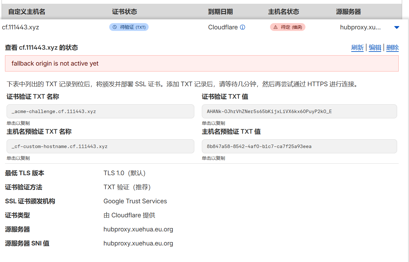 TXT验证【注意自定义主机域名不能托管在cloudflare】